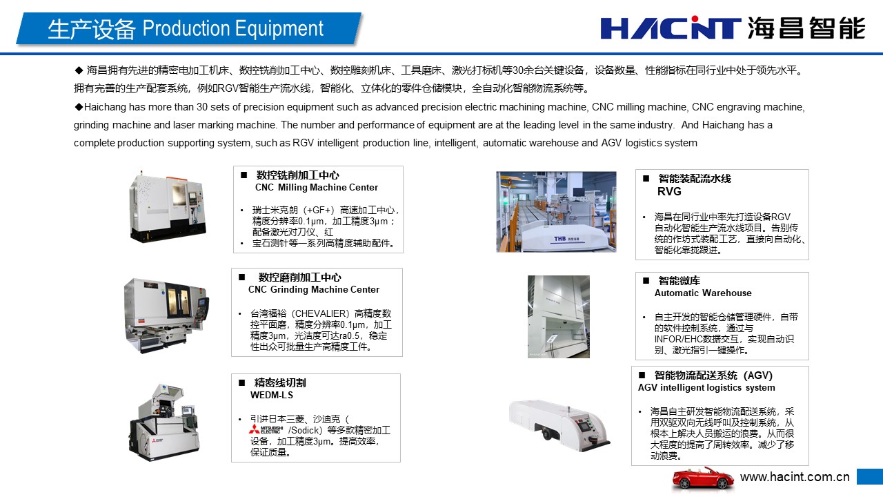 海昌擁有精密電加工機(jī)床、數(shù)控銑削加工中心、數(shù)控雕刻機(jī)床、工具磨床、激光打標(biāo)機(jī)等30余臺(tái)關(guān)鍵設(shè)備。擁有完善的生產(chǎn)配套系統(tǒng),例如RGV智能生產(chǎn)流水線,智能化、立體化的零件倉(cāng)儲(chǔ)模塊,全自動(dòng)化智能物流系統(tǒng)等。