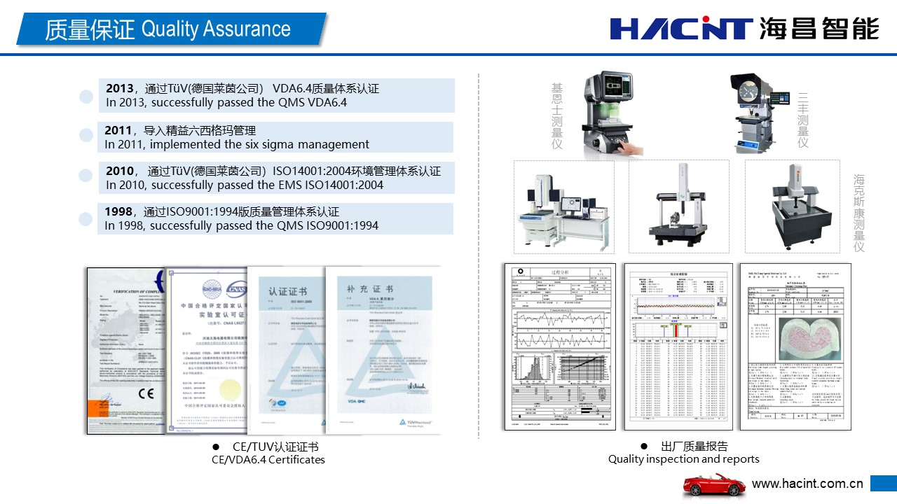 公司依據(jù)ISO9001:2000的要求,結合客戶的特殊要求,不斷修改、完善公司的質量管理體系。公司注重產品安全性、可靠性的提升,先后通過了ISO9001、ISO14001、VDA6.4等體系,主要產品于2008年通過SGS公司CE認證。 在產品研發(fā)、生產制造和售后服務等各階段、全過程進行質量控制,確保所有崗位、所有環(huán)節(jié)都有章可循。